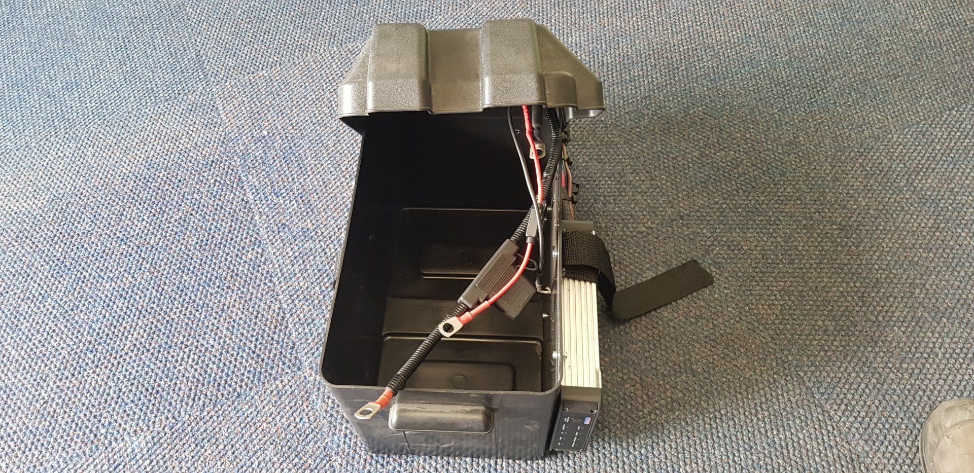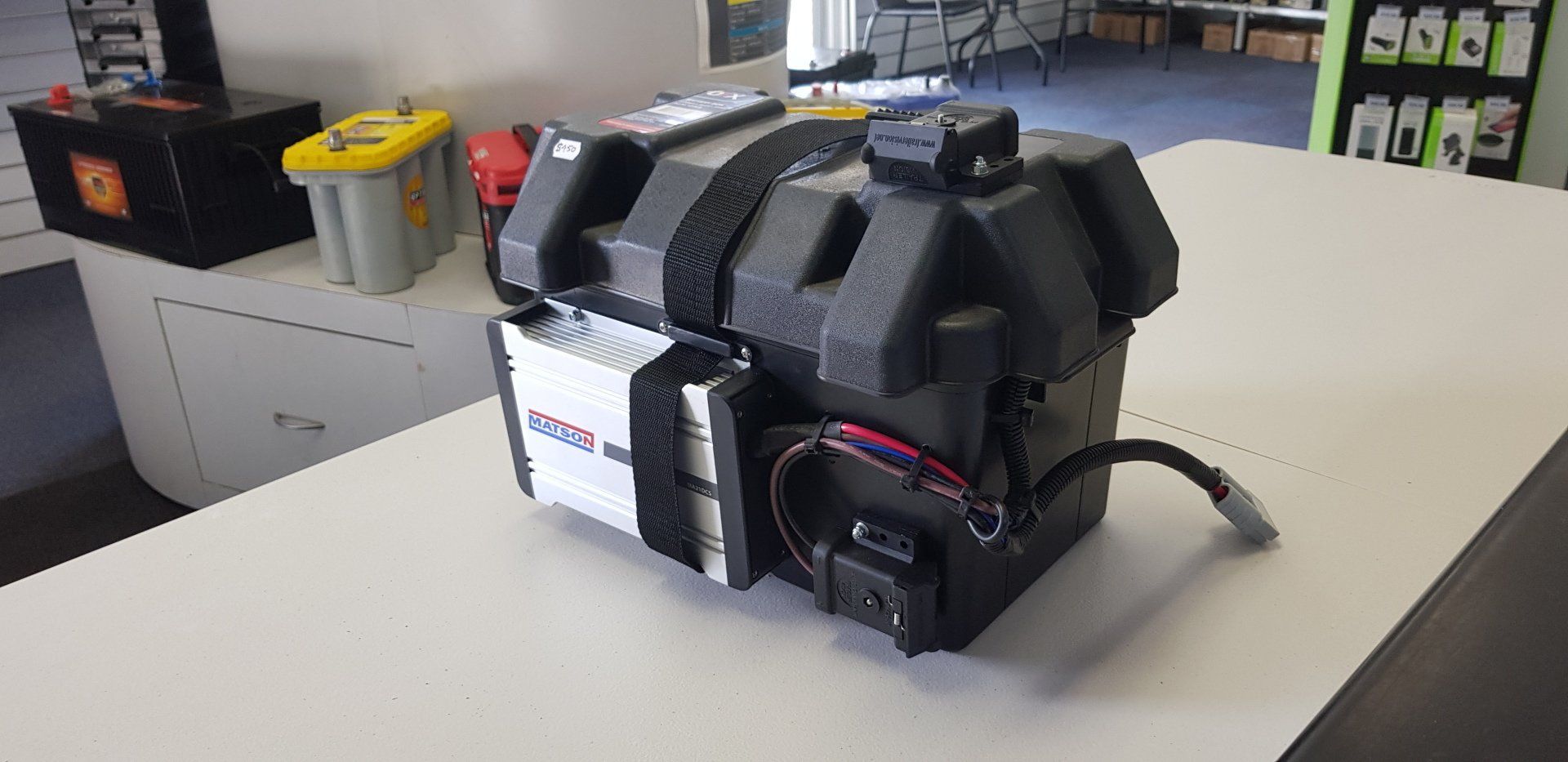 Our Power box comes with a Matson DC to DC charger, solar input and Anderson plug output for fridge, lights, power tools, etc. We can fit up to a 120 A/H Deep Cycle battery to run all your accessories that you will use. The DC charger will charge the battery when driving and you can also plug a solar panel in when your at site to keep the power going.